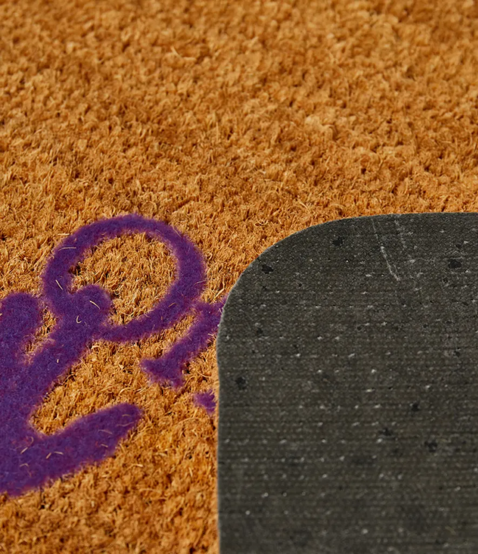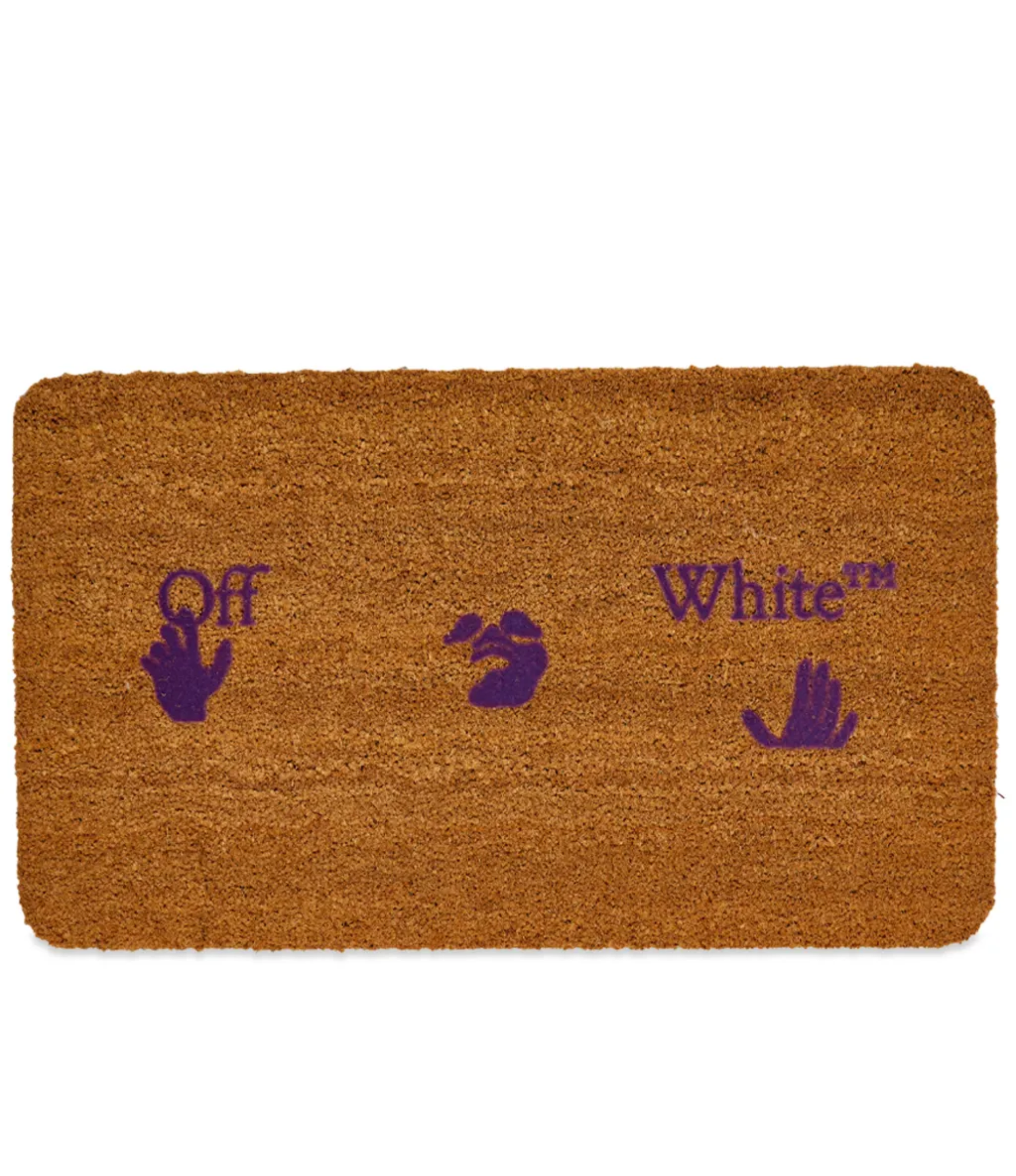 El diseño rectangular con bordes redondeados presenta el swimming man en silueta estilizada junto a la firma "OFF-WHITE" en letras moradas prominentes, aportando un statement sutil pero inconfundible que transforma un elemento cotidiano en pieza de decoración con actitud. Su construcción en fibra de coco 100 % natural ofrece durabilidad, capacidad de absorción y resistencia al desgaste, ideal para entradas, pasillos o zonas de alto tráfico.