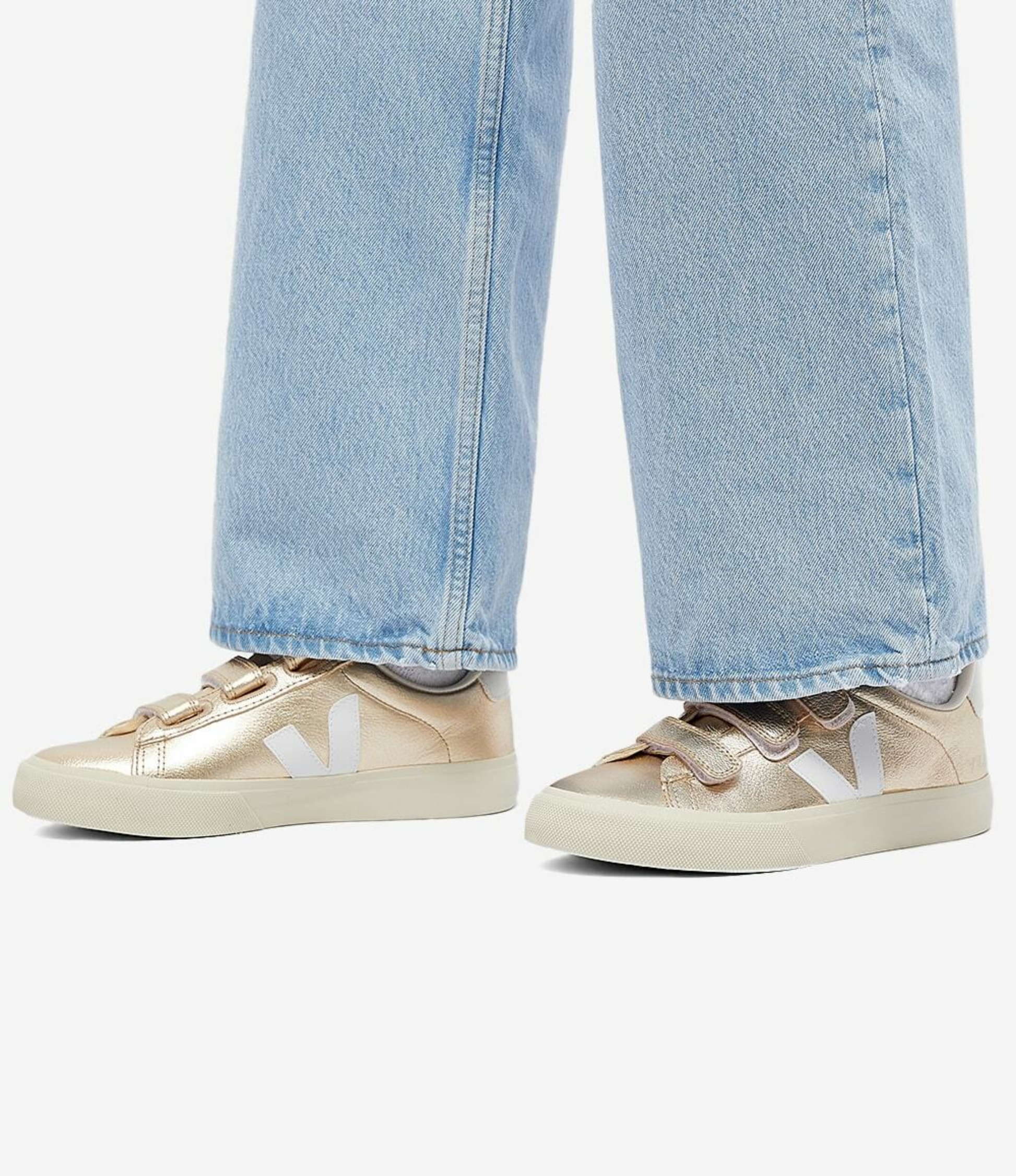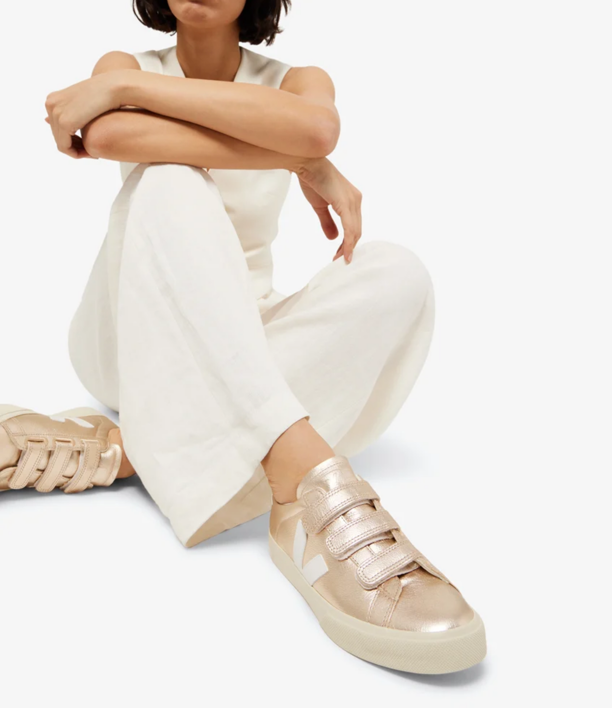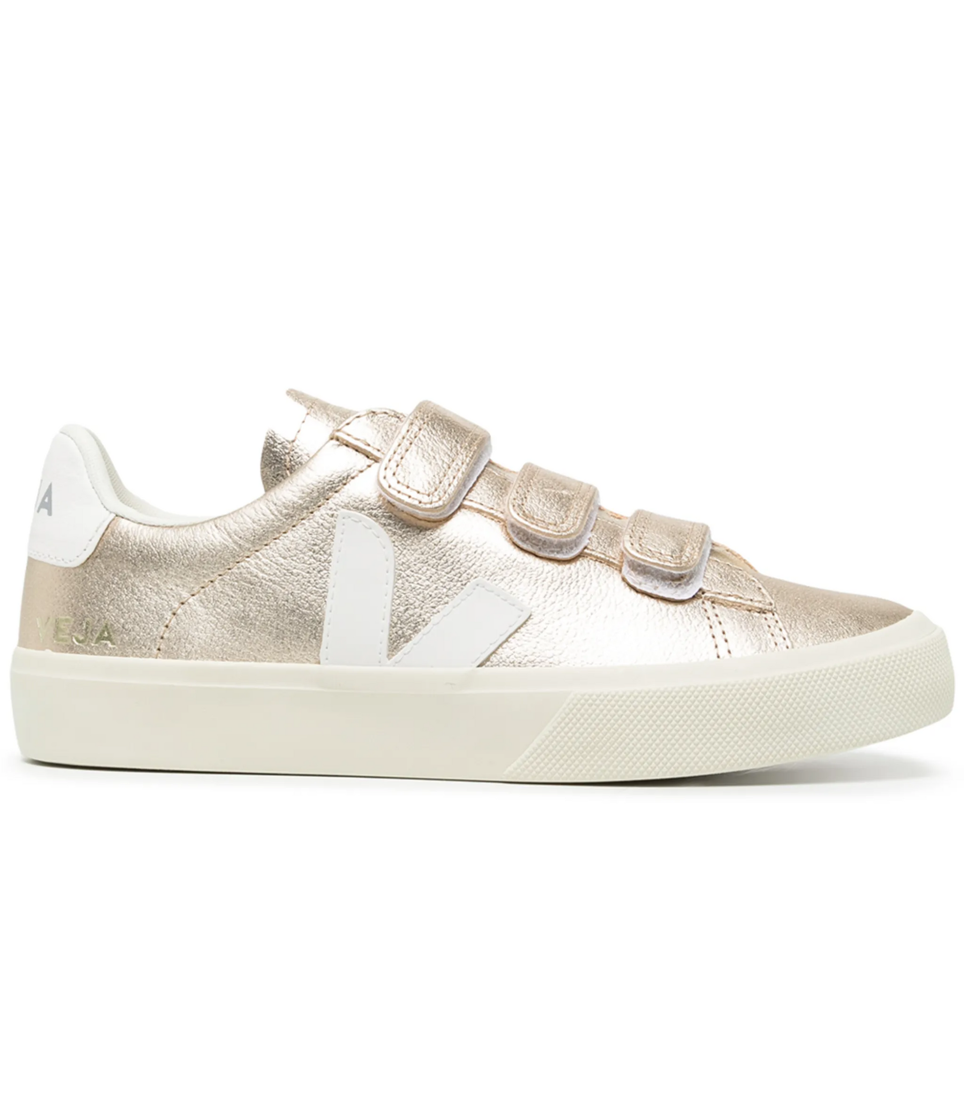 Elegancia minimalista con un toque metálico. Los VEJA Recife en tonos Platine y blanco reinventan el clásico sneaker con un diseño de tiras de velcro, ideal para un ajuste práctico y moderno. Fabricados con materiales sostenibles como cuero ecológico, algodón orgánico y caucho silvestre, combinan lujo discreto con conciencia ambiental.